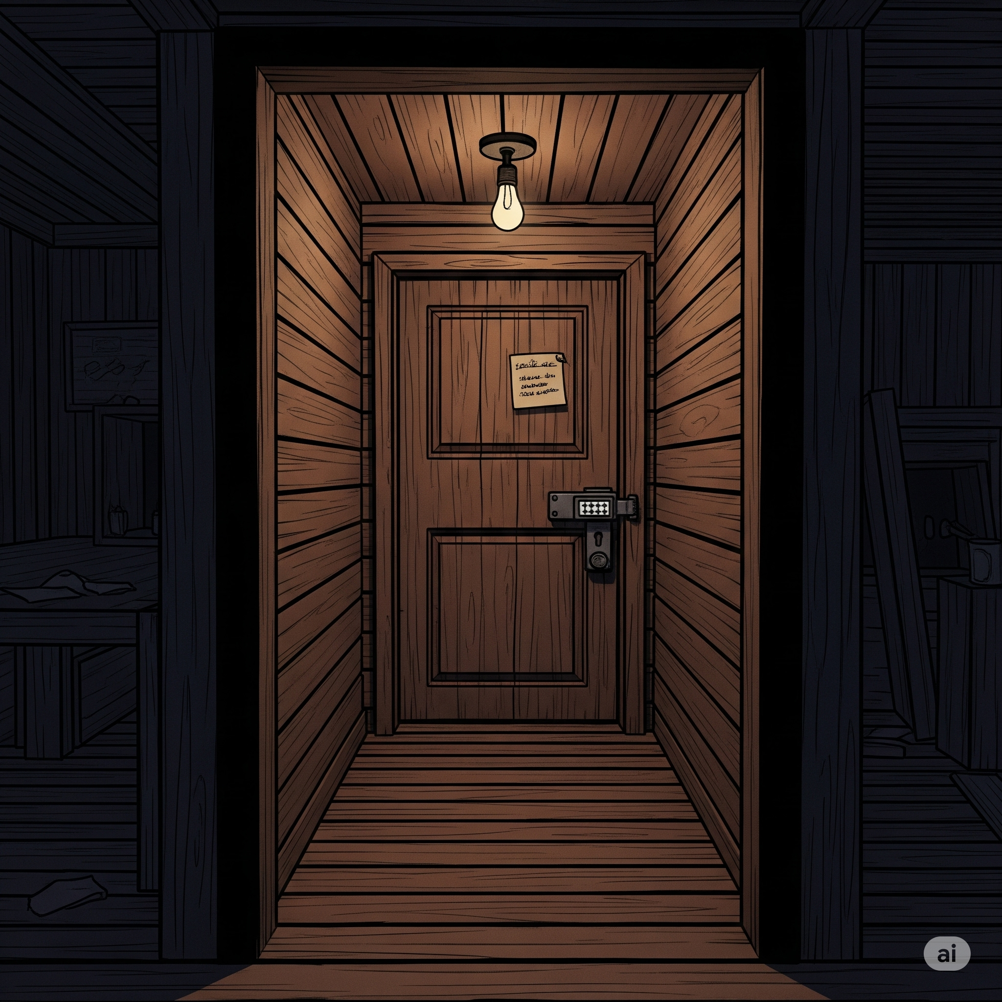 Langsam setzt Du einen Fuß vor den anderen. Die Dielen unter Deinen Schritten ächzen, als wollten sie Dich warnen, aber Du spürst, dass Dein Kopf endlich wieder klar ist. Kein Schwindel mehr – nur die Gewissheit, dass Gormsky irgendwo hier den entscheidenden Hinweis versteckt haben muss. „Vielleicht hat er die Kombination im Büro deponiert? Oder wenigstens einen Anhaltspunkt. Ich kann es mir nicht leisten, Zeit zu verlieren – ich will auf diese Konferenz…“ Das flackernde Licht der einzigen Glühbirne wirft zuckende Schatten an die Wände. Am Ende des Flurs wartet eine schwere Holztür. Ein Zahlenschloss hängt an der Klinke, daneben ein leicht vergilbter Zettel mit Gormskys Handschrift und einer Gedächtnisstütze: